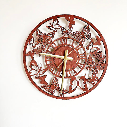 Butterfly Garden Wall Clock, Laser Cut Floral Clock, Cherry Wood Stained Birch Plywood, Silent Wall Decor, Nature Inspired Home Art