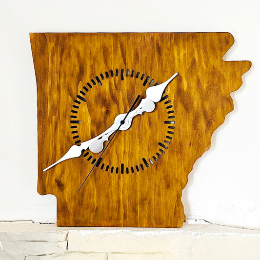 Handmade Arkansas Wall Clock – Rustic State Shape Clock, 6mm Plywood, Chestnut/Oak Wood Stain, Unique Gift for Home or Office Décor - 13.4 inch