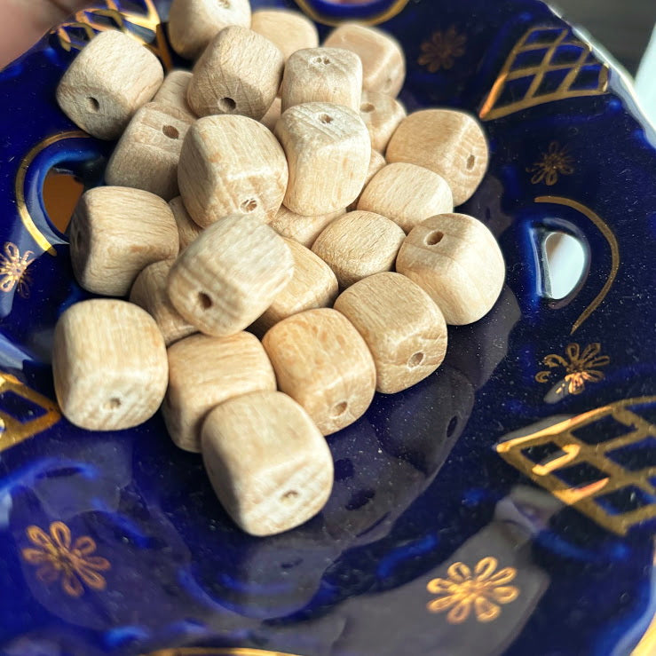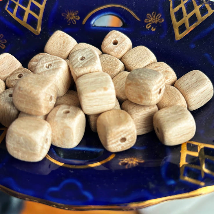 These natural cube-shaped wooden beads are made from solid beech wood and carefully shaped and drilled for craft use.