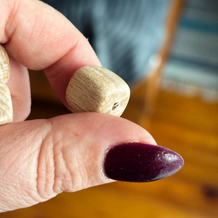 On the photo you can see the natural variation in beech wood — subtle differences in tone and grain that make every bead unique.