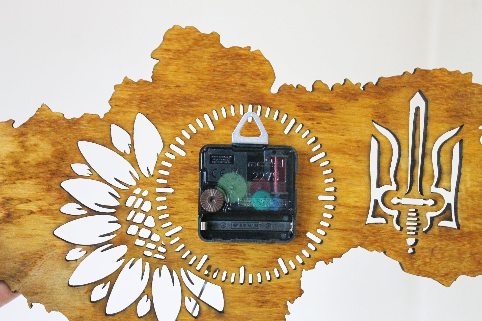 Handmade Wooden Wall Clock – Ukraine Map Shape – Walnut Stain – Sunflower & Tryzub Design